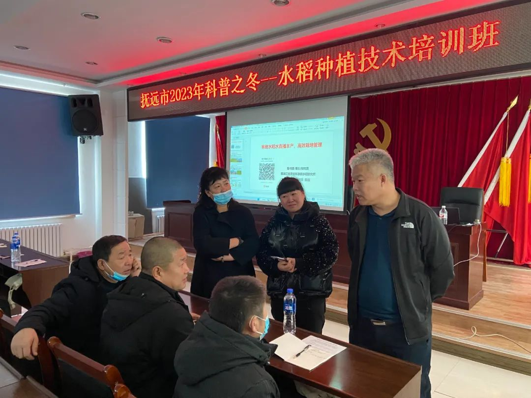 2月21-24日,黑龙江省农业科学院水稻研究所陈书强研究员带领王立楠、周雪松、蔡永盛3名科技特派员组成专家技术服务队,前往抚远市、富锦市和集贤县等地开展科技培训,与当地乡镇进行服务对接,为农户备春耕发挥科技赋能作用。21日和24日,专家技术服务队分别在抚远市和集贤县组织专场科技培训会。会上,陈书强认真分析了当前水稻生产中存在的问题,详细讲解了寒地水稻插秧与直播高产优质高效栽培管理技术以及寒地水稻高产、优质、高效种植技术,并进行了现场互动答疑。