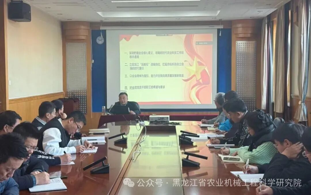 12月11日,省农机院召开党的二十届四中全会精神专题宣讲会。省农科院党组成员,省农机院党委书记、院长张燕梁面向科技处试验中心党支部、田间机械化研究所党支部、绥化农机分院全体党员干部宣讲党的二十届四中全会精神。此次宣讲紧扣政治建设核心,旨在推动全会精神与农机科研工作深度融合,为全院高质量发展保驾护航。