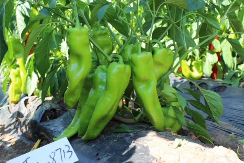 特征特性: 辣椒雄性不育三系杂交品种,早熟,6-7片叶现蕾,分杈早,幼椒果胎大,膨大快,连续座果强,大牛角型,横经6.0cm、纵径26-32cm左右,单果重120克,浅绿色,辣味适中,抗疫病、病毒病、枯萎病,炭疽病,耐贮运,亩产6000公斤以上,是北菜南运理想的品种。
